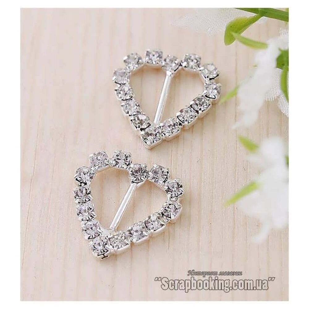 Декоративна металева пряжка зі стразами у вигляді серця. Розмір пряжки 21х20мм. Внутрішній розмір стрічки 10 мм. Використовується як прикраса для декору альбомів, листівок, особливо весільної тематики.