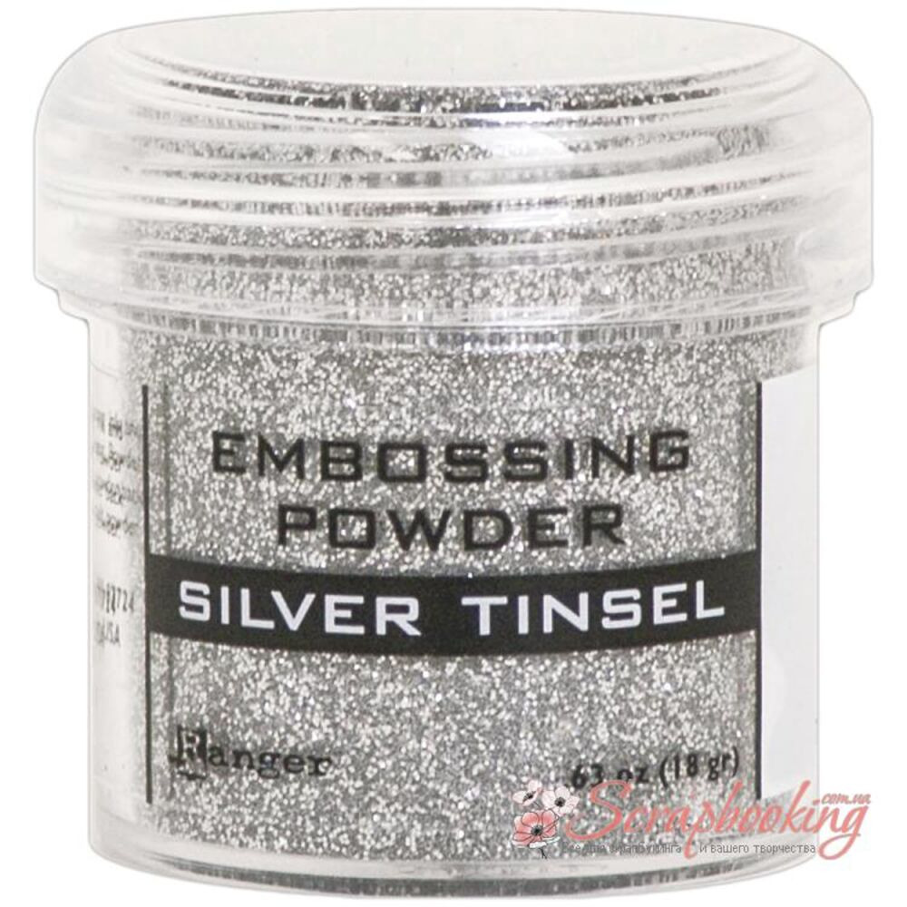 Високоякісна пудра для гарячого ембосингу із блискітками Silver Tinsel сріблястого кольору від компанії Ranger об'ємом. Висота баночки 4 см, діаметр – 3.5 см. Вага 18 грам