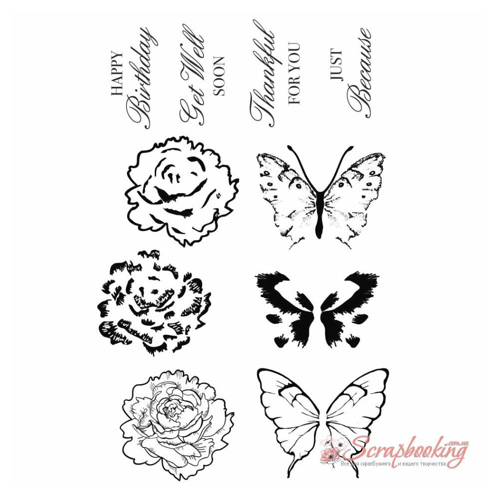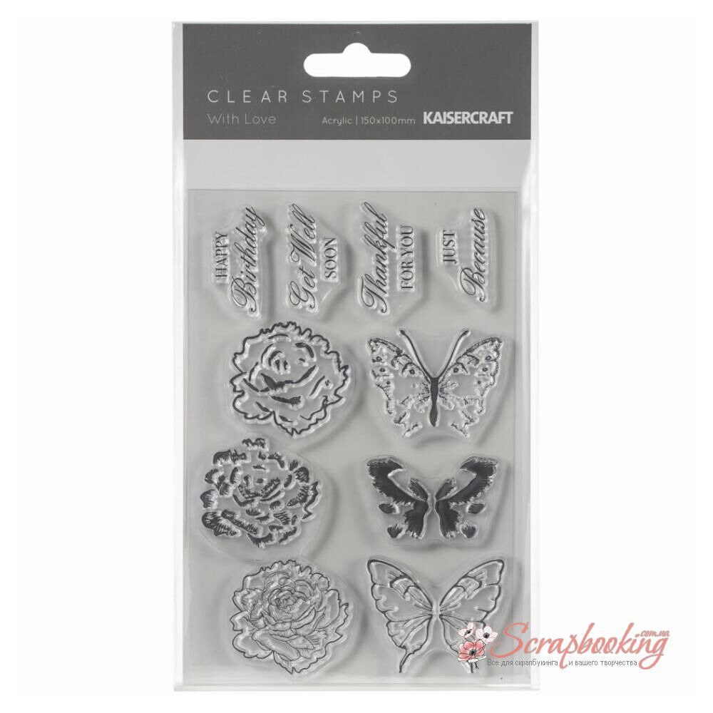 Набір акрилових штампів With Love від виробника Kaisercraft. Розмір штампа 10*15см. Призначений для отримання відбитків, представлених на фото, на папері за допомогою акрилового блоку і фарби для Штампінгу (можна придбати додатково)