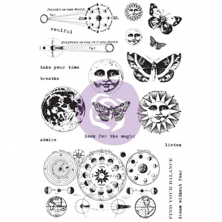 Комплект акрилових штампів Dream Without Fear від виробника Prima. Розмір упаковки, на якій розташовано 20 штампів: 10*13см. Призначений для отримання відбитків, представлених на фото, на папері за допомогою акрилового блоку та фарби для штампінгу (придбані додатково)