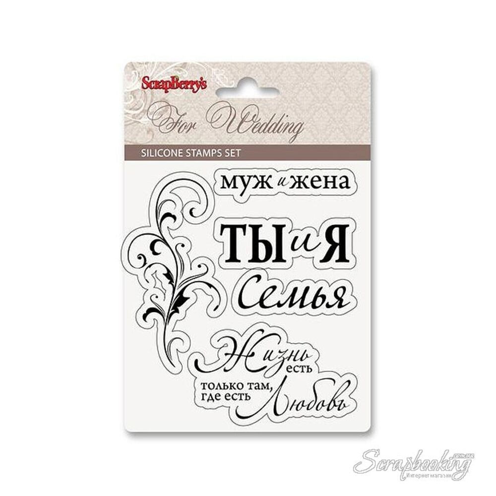 Набір акрилових штампів Scrapberry Весільна колекція; - набір 2, 5 шт, розмір 10х11 см, SCB220602628. Розмір штампів від 0.9х5.4 до 3.8х7.8 см. Призначені для отримання відбитків, представлених на фото, на папері за допомогою акрилового блоку і фарби для Штампінгу (можна придбати додатково)