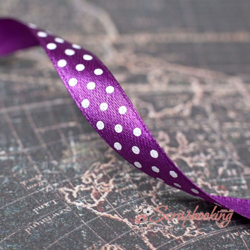 Декоративна атласна стрічка з крапками білого кольору на сливовій основі. Ширина стрічки 10мм. Ціна вказана за 1 метр. Використовується при упаковці подарунків, як декоративний елемент при виготовленні листівок, альбомів, блокнотів.
