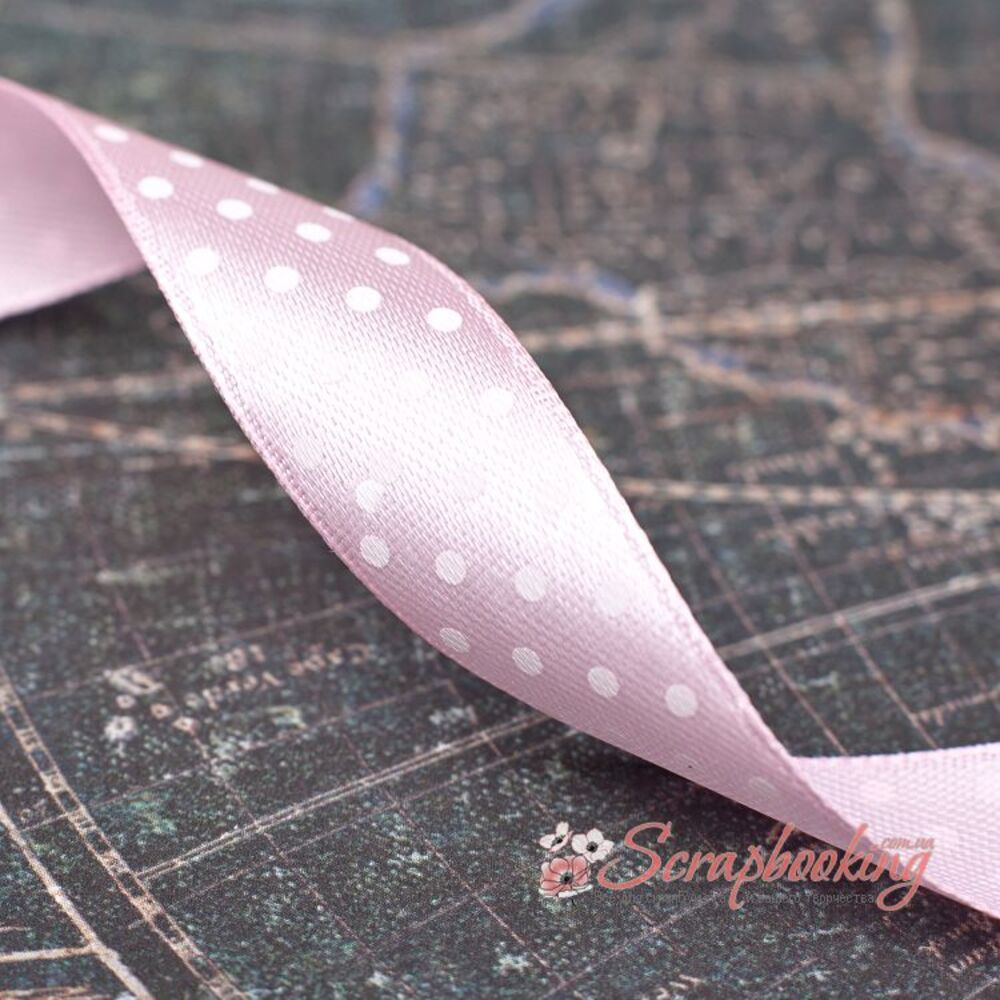 Декоративна атласна стрічка з крапками білого кольору на блідо-рожевій основі. Ширина стрічки 15мм. Ціна вказана за 1 метр. Використовується при упаковці подарунків, як декоративний елемент при виготовленні листівок, альбомів, блокнотів.