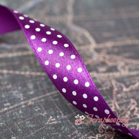 Декоративна атласна стрічка з крапками білого кольору на сливовій основі. Ширина стрічки 15мм. Ціна вказана за 1 метр. Використовується при упаковці подарунків, як декоративний елемент при виготовленні листівок, альбомів, блокнотів.