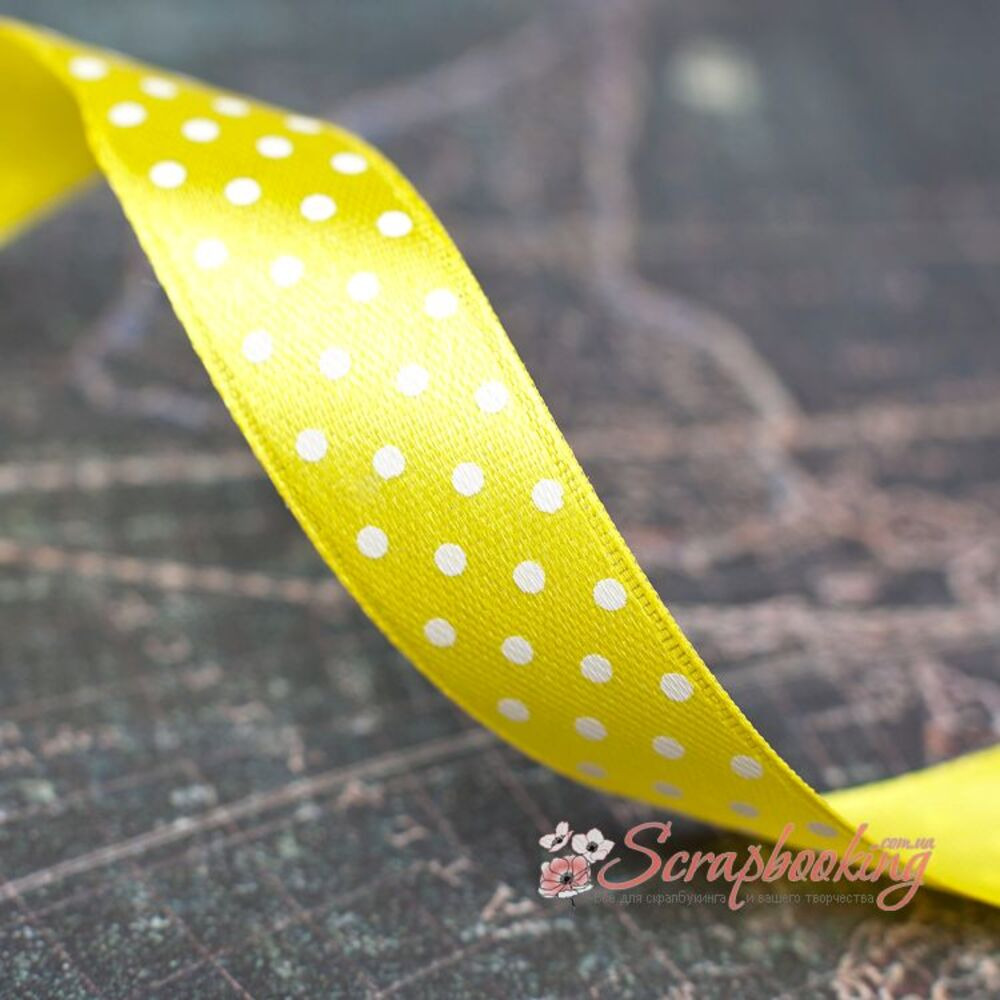 Декоративна атласна стрічка з крапками білого кольору на жовтій основі. Ширина стрічки 15мм. Ціна вказана за 1 метр. Використовується при упаковці подарунків, як декоративний елемент при виготовленні листівок, альбомів, блокнотів.