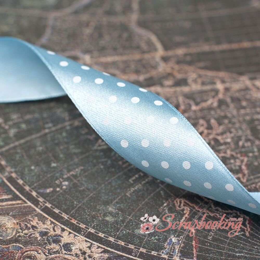 Декоративна атласна стрічка з крапками білого кольору на блакитній основі. Ширина стрічки 25мм. Ціна вказана за 1 метр. Використовується при упаковці подарунків, як декоративний елемент при виготовленні листівок, альбомів, блокнотів.