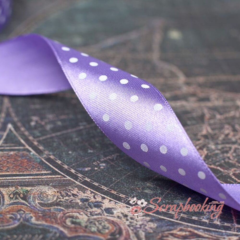 Декоративна атласна стрічка з крапками білого кольору на фіолетовій основі. Ширина стрічки 25мм. Ціна вказана за 1 метр. Використовується при упаковці подарунків, як декоративний елемент при виготовленні листівок, альбомів, блокнотів.