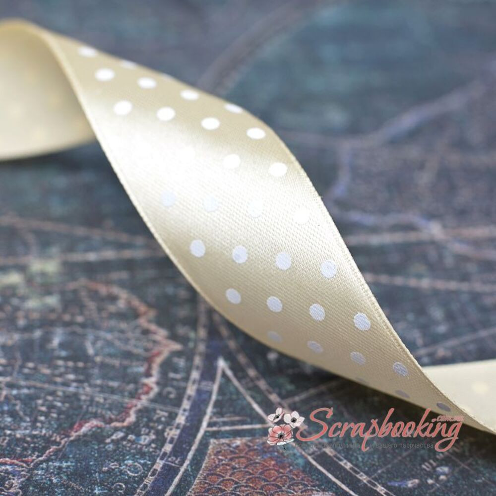 Декоративна атласна стрічка з білими точками на бежевій основі. Ширина стрічки 25мм. Ціна вказана за 1 метр. Використовується при упаковці подарунків, як декоративний елемент при виготовленні листівок, альбомів, блокнотів.