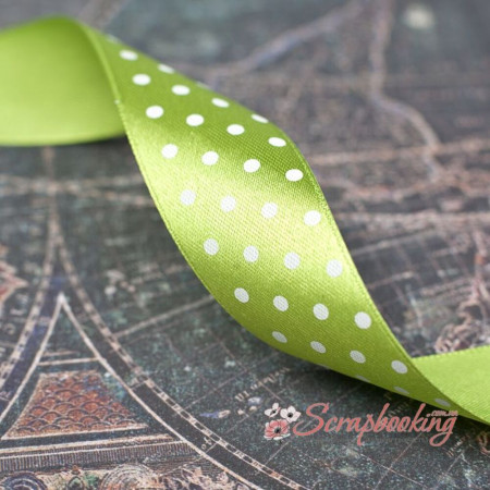 Декоративна атласна стрічка з крапками білого кольору на основі салату. Ширина стрічки 25мм. Ціна вказана за 1 метр. Використовується при упаковці подарунків, як декоративний елемент при виготовленні листівок, альбомів, блокнотів.
