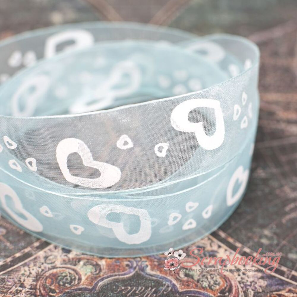 Стрічка з органзи блакитного кольору із нанесеними сердечками білого кольору шириною 25мм.Ціна вказана за 1 метр. Найніжніші стрічки з органзи застосовуються при виготовленні бантів, шпильок для волосся, при упаковці подарунків, як декоративний елемент при виготовленні листівок, альбомів, блокнотів.