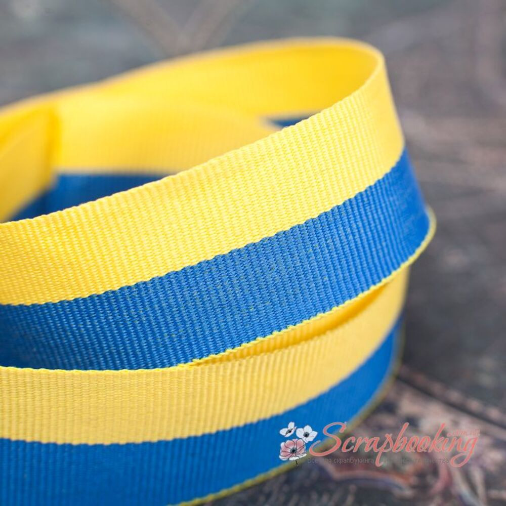 Ріпсова стрічка жовто-блакитного кольору шириною 25мм. Ціна вказана за 1 метр. Репсова стрічка є стрічкою з рубчиками. Використовується при упаковці подарунків, як декоративний елемент при виготовленні листівок, альбомів, блокнотів.