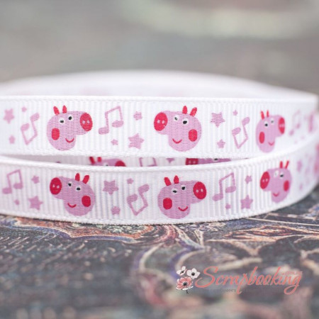 Ріпсова стрічка із зображенням свинки Пеппа рожевого кольору на білій основі. Ширина стрічки 9мм. Ціна вказана за 1 метр. Репсова стрічка є стрічкою з рубчиками. Використовується при упаковці подарунків, як декоративний елемент при виготовленні листівок, альбомів, блокнотів.
