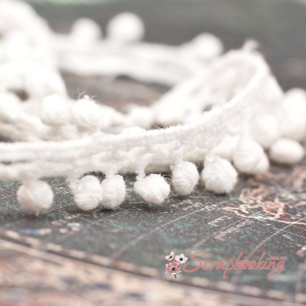 Декоративна стрічка тасьма з помпонами білого кольору. Ширина тасьми 10мм. Ціна вказана за 1 метр. Використовується для оформлення листівок та альбомів, для упаковки подарунків, при декоруванні предметів інтер'єру