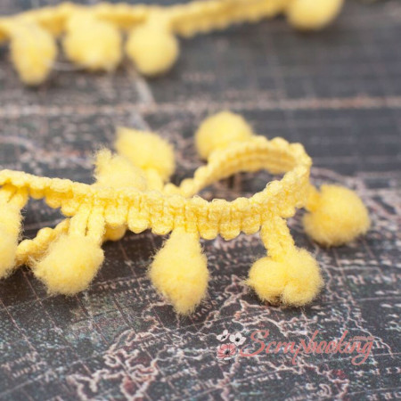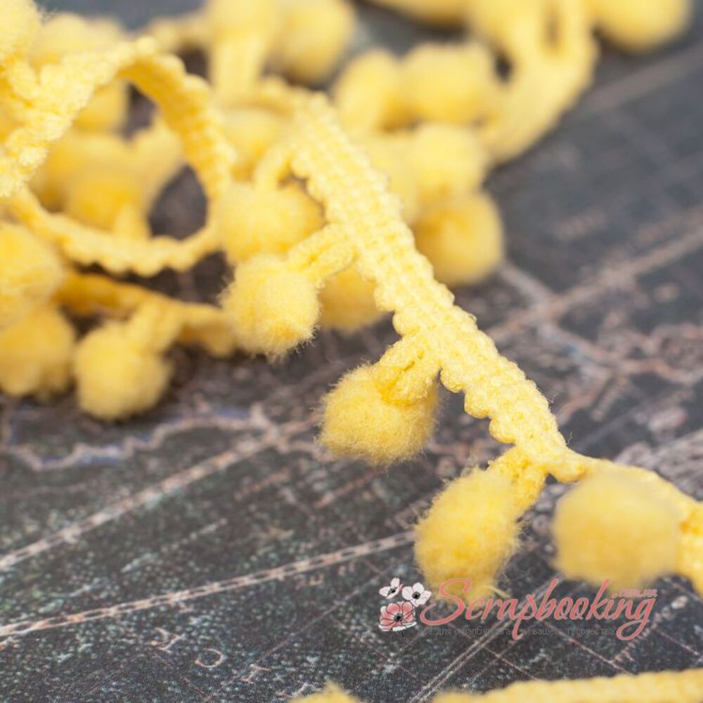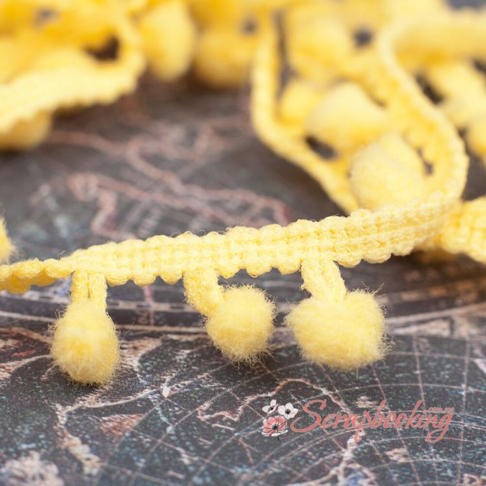 Декоративна стрічка тасьма з помпонами жовтого кольору. Ширина тасьми 15мм. Ціна вказана за 1 метр. Використовується для оформлення листівок та альбомів, для упаковки подарунків, при декоруванні предметів інтер'єру