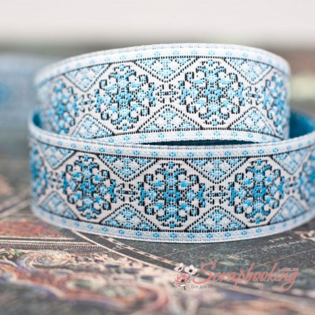 Декоративна жакардова тасьма з орнаментом блакитного кольору. Ширина тасьми 20мм.Ціна вказана за 1 метр. Використовується для оформлення листівок та альбомів, для упаковки подарунків, при декоруванні предметів інтер'єру
