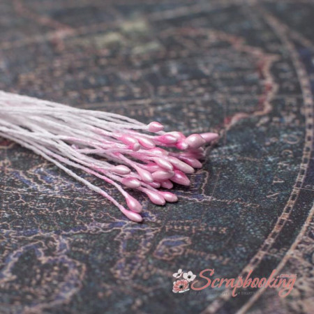 Декоративні тичинки перламутрові рожевого кольору. Діаметр тичинки 1мм. В упаковці 30 гілочок по тичинці з кожного боку. Застосовуються при виготовленні кольорів ручної роботи або як самостійні прикраси