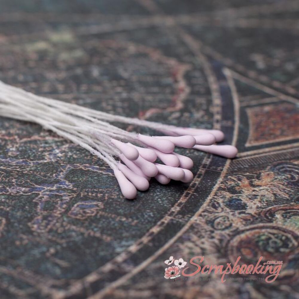 Декоративні тичинки матового бузкового кольору. Діаметр тичинки 2мм. В упаковці 20 гілочок по тичинці з кожного боку. Застосовуються при виготовленні кольорів ручної роботи або як самостійні прикраси