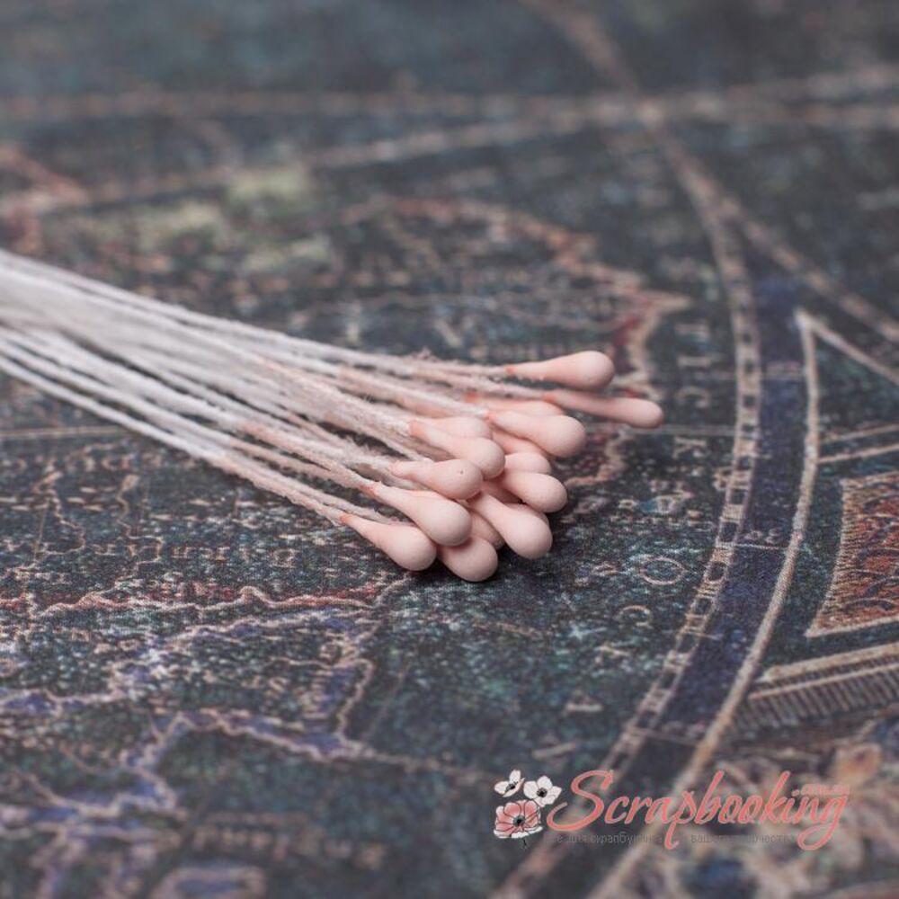 Декоративні тичинки матового персикового кольору. Діаметр тичинки 2мм. В упаковці 20 гілочок по тичинці з кожного боку. Застосовуються при виготовленні кольорів ручної роботи або як самостійні прикраси
