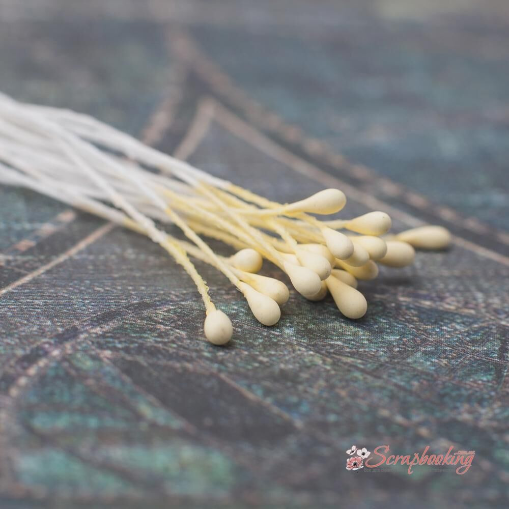 Декоративні тичинки матового жовтого кольору. Діаметр тичинки 2мм. В упаковці 20 гілочок по тичинці з кожного боку. Застосовуються при виготовленні кольорів ручної роботи або як самостійні прикраси