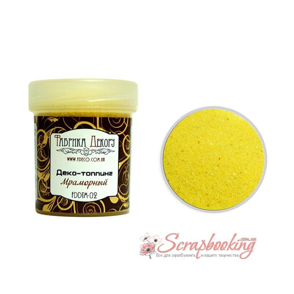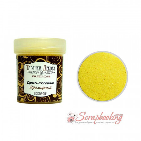 Топінг декоративний мармуровий Лимонний фреш – це натуральні частинки мармуру 0,5-1 мм, пофарбовані у яскраві кольори. Ідеально підходить для декорування будь-яких поверхонь, створення додаткової текстури та об'єму.