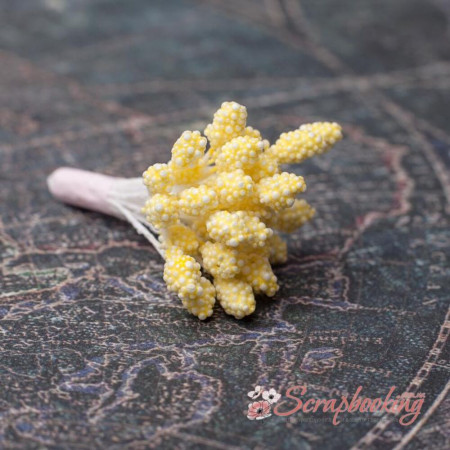 Декоративные тычинки желтого цвета. Размер тычинки 0.5*2.75мм. В упаковке 30 веточек с тычинками. Применяются при изготовлении цветов ручной работы или в качестве самостоятельных украшений