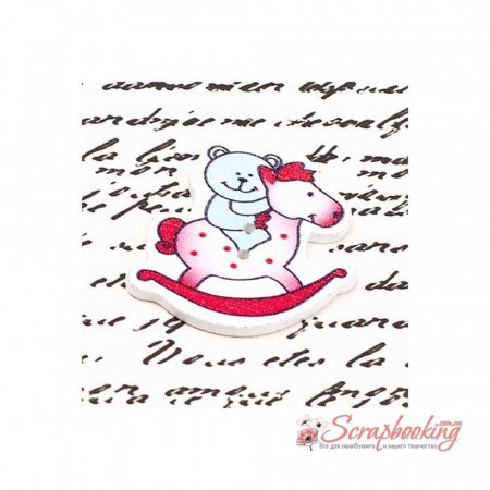 Дерев'яний пофарбований гудзик ведмедик на конячці. Розмір ґудзика 33*31мм. Є отвори для пришивання.