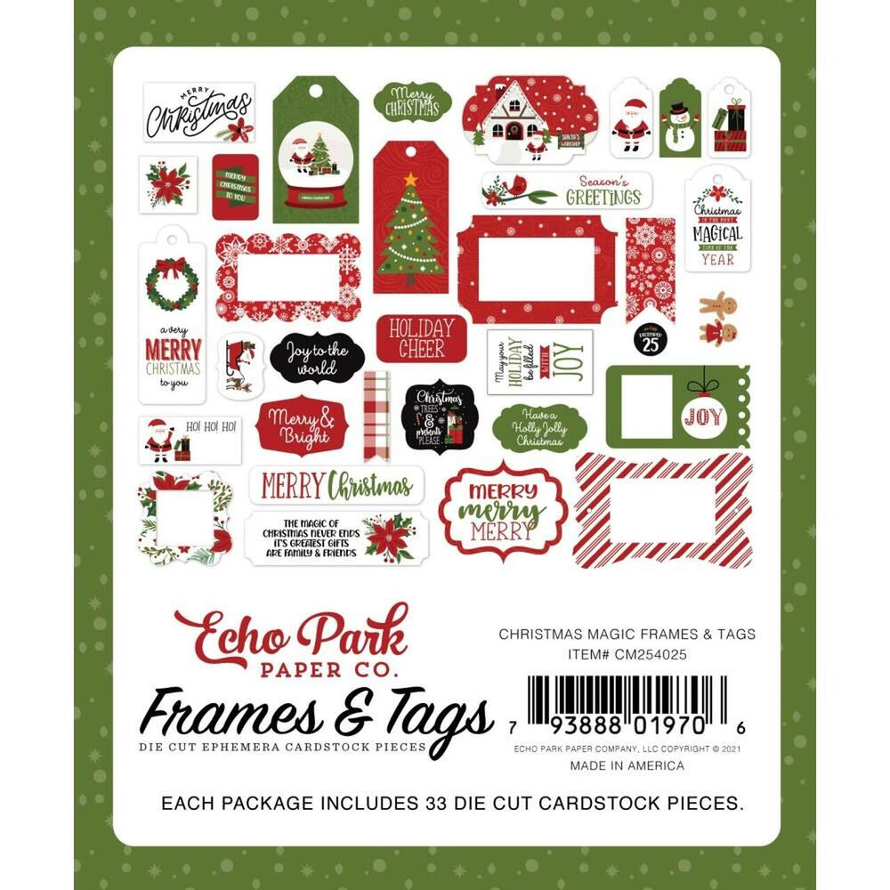 Висічки Frames & Tags із колекції Christmas Magic від виробника Echo Park. В упаковці декоративні висічки в кількості 33шт. Щільність висічок 180гр/м2. Розмір упакування 11,5*13,5см