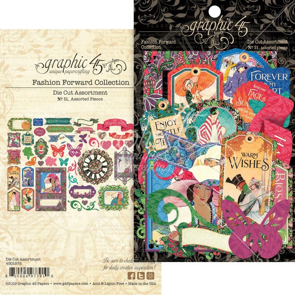 Набір висічок з колекції Fashion Forward виробника Graphic 45. В упаковці Висічки різноманітних розмірів і дизайнів в кількості 51шт. Розмір упаковки 11 * 18см. Архівна якість.