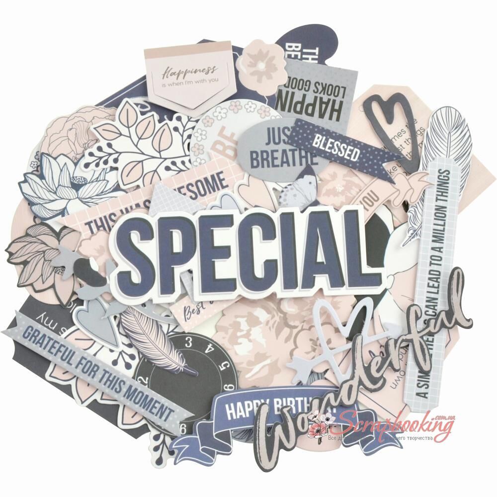 Висічки з колекції Breathe від виробника Kaisercraft. У наборі понад 40 висічок з щільного паперу. Розмір упаковки 90 * 150мм